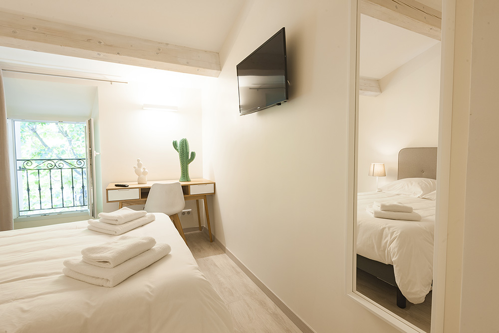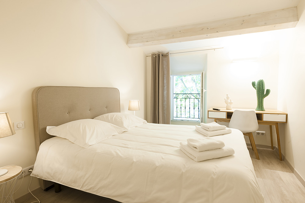 Cette chambre lumineuse au style épuré offre une atmosphère paisible et chaleureuse. Dotée d’un lit double confortable, d’un coin bureau en bois clair et d’une jolie vue sur la verdure et le village, elle allie confort moderne et décoration soignée. L’ambiance naturelle, les matières douces et les détails soignés invitent à la détente. Parfaite pour un séjour reposant au cœur de Collobrières.