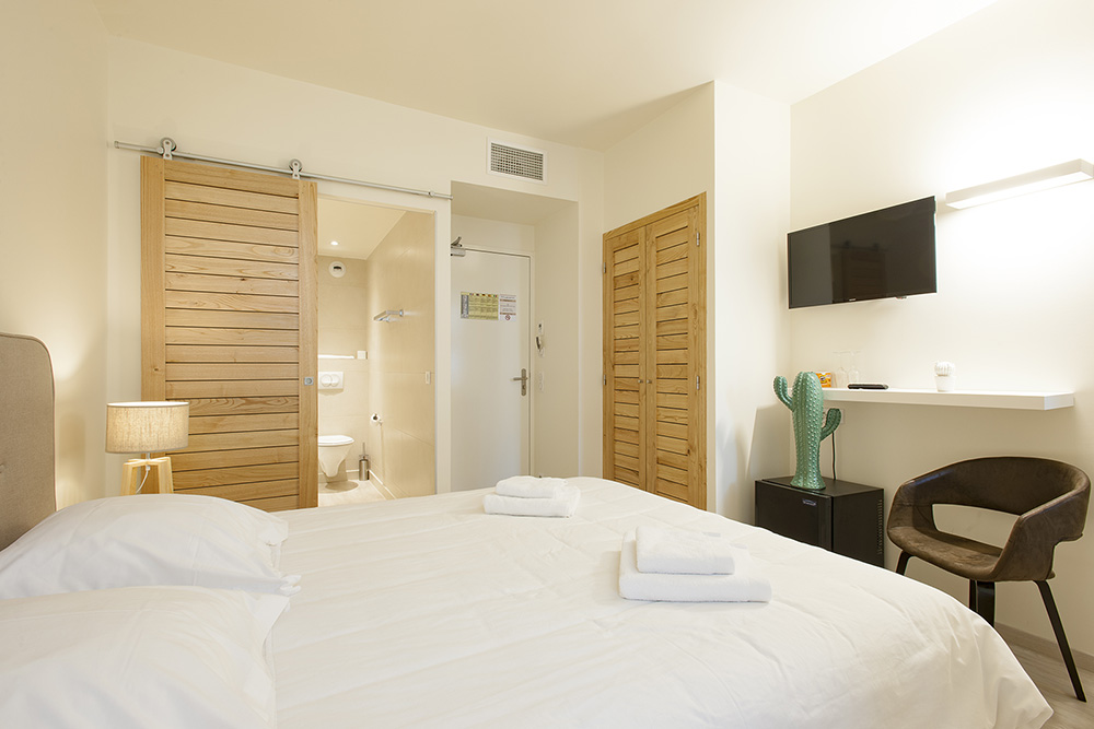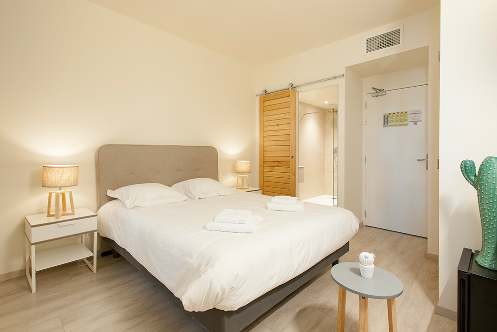 Un cocon calme et cosy, parfait pour se détendre après une journée de découverte. Dotée d’un grand lit double, d’un coin bureau, de rangements pratiques et d’une salle de bain privative, elle allie simplicité, élégance et bien-être dans une ambiance douce.