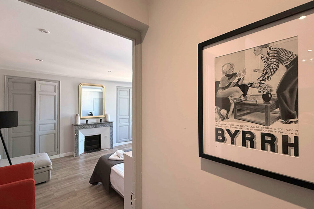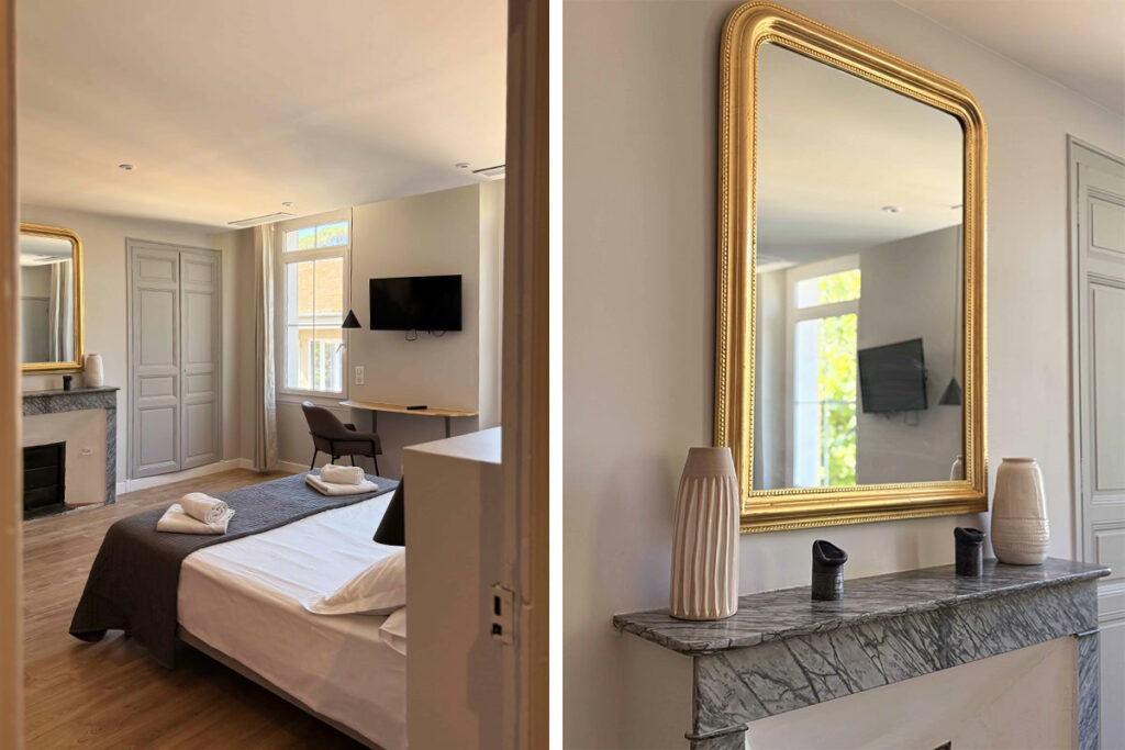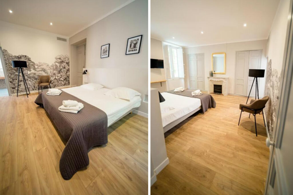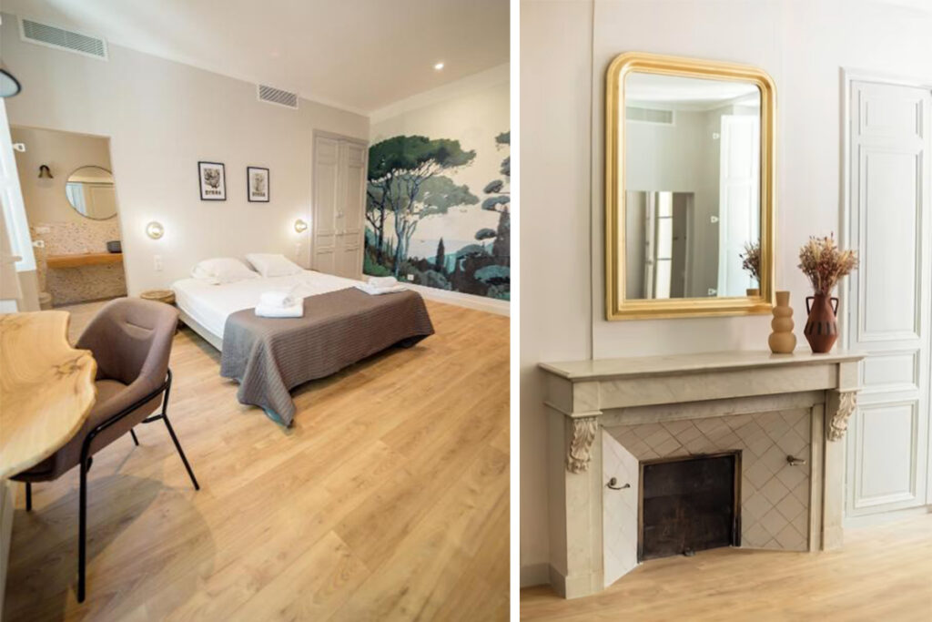 Cette chambre spacieuse et lumineuse vous séduira par sa fresque poétique, sa cheminée en marbre et son ambiance douce. Un havre de paix au cœur de Collobrières, entre art et authenticité.